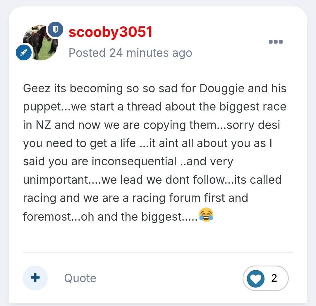 Here is a question or two for the experts then Would horses like Wahid, Jimmy Choux and Silent Achiever, who had shown good form in the months leading up to the Derby in 1600m races, and who were then aimed at the Derby with runs in typical lead up races like the Waikato and Avondale Guines, would they have gone on to run in the Derby or NZB Kiwi if it had of existed on the same day as the Derby. Would Excellent have run in the Derby or Kiwi under the same scenario. I see, he who never had an original thought, getting ideas for threads from this site. I note Chief Stipe, that there is hope for you yet lol, with the thread on this site getting more views and a lot more replies. Admittedly 12 out of 18 have been mine