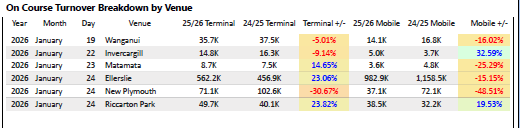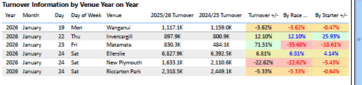 Jan-26 Date Club Stakes Combined T/O per $ Ranking Oncourse O/Course T/O Ranking Turnover of stakes Turnover per $ of Stakes 16/01/2026 Waikato TR 146520 1676200 11.44 2 50300 0.34 11 10/01/2026 Kumara 236625 2516800 10.64 3 342200 1.45 2 9/01/2026 Otaki 146520 1447600 9.88 4 61800 0.42 9 2/01/2026 Wairarapa 142450 1382800 9.71 5 336800 2.36 1 1/01/2026 Riverton 200875 1931200 9.61 6 106800 0.53 7 6/01/2026 Ruakaka 163390 1473700 9.02 7 180700 1.11 4 18/01/2026 Auckland TRI(Puke) 195625 1709000 8.74 8 26200 0.13 23 4/01/2026 Greymouth 172935 1464600 8.47 9 133300 0.77 5 7/01/2026 Reefton 175350 1270600 7.25 10 132400 0.76 6 14/01/2026 Canterbury Racing 199250 1434200 7.20 11 42200 0.21 17 19/01/2026 Whanganui 163170 1117100 6.85 12 49800 0.31 12 3/01/2026 Thames(Te Aroha) 147745 1006300 6.81 13 73600 0.50 8 10/01/2026 Wanganui JC 308250 2020600 6.56 14 54100 0.18 20 24/01/2026 Canterbury 448200 2813500 6.28 15 88200 0.20 18 8/01/2026 Tauranga 289975 1746600 6.02 16 59200 0.20 18 22/01/2026 Southland 150785 897900 5.95 17 19800 0.13 23 17/01/2026 Waikouaiti RC 366325 2135200 5.83 18 87400 0.24 15 11/01/2026 Auckland TRI 452575 2488100 5.50 19 100500 0.22 16 23/01/2026 Matamata 191875 830300 4.33 20 12300 0.06 25 24/01/2026 Taranaki 405325 1633100 4.03 21 108200 0.27 14 1/01/2026 Auckland TRI 1491275 5859400 3.93 22 454200 0.30 13 17/01/2026 Wellington RC 1233500 4182800 3.39 23 171100 0.14 22 3/01/2026 Wellington RC 1512575 4728500 3.13 24 231300 0.15 21 24/01/2026 Auckland TRI 4442500 6827900 1.54 25 1545100 0.35 10