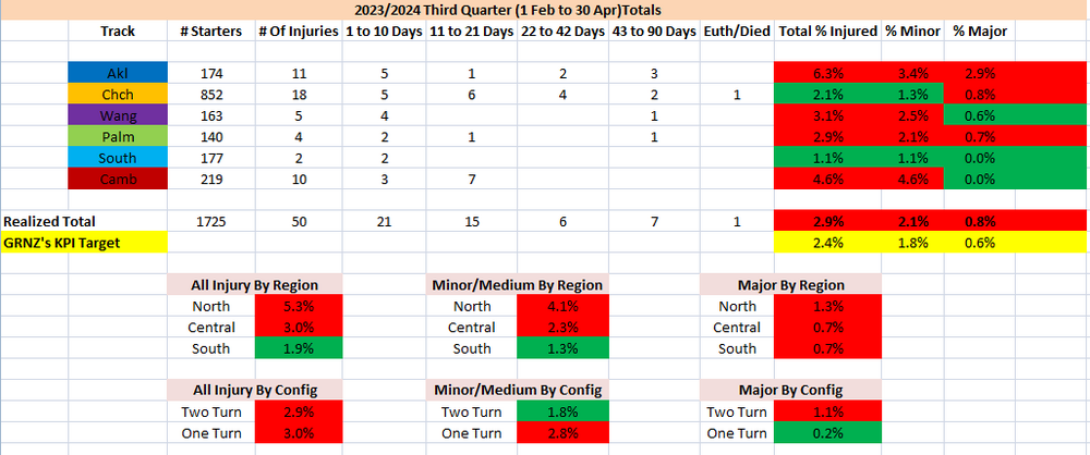 Current up to date 2023/2024 season data (realized) at the end of yesterday. Ok, I'll manipulate the data (temporarily) to make a point. Imagine GRNZ shut down Auckland and transferred all racing operations to Cambridge since the beginning of the 2023/2024 season on 1 Aug. I've taken all Auckland's starts and added them to the existing Cambridge starts. Then I've increased the existing injuries to the original Cambridge data, so their injury percentages equaled what they were originally. Suddenly it makes the overall season much closer to the GRNZ KPI target & could be possible to achieve it when the weather changes more towards winter & the track become historically safer. Suddenly overall injuries are nearly (0.1% over) within the KPI. Minor/Medium injuries match the KPI. Major injuries are nearly (0.1% over) within the KPI. Moving this seasons Auckland's race meets to Cambridge could have made the racing season a safe season by GRNZ standards. With no racing in Auckland it would give the opportunity to fix the track, similar to what they've done in Wanganui by using PN. Water under the bridge. GRNZ has failed again. Back to reality. Ouch...