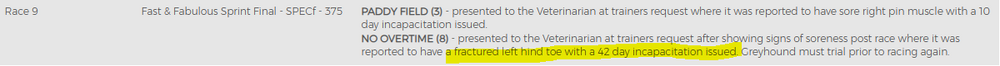A minimum of 7.4% of the greyhounds that raced were injured during their race on Sunday in Auckland. 7 post-race injuries required a stand-down out of a total of the 94 individual starters. No-one knows how many more injuries showed up after cooling-down or overnight. https://www.grnz.co.nz/catch-the-action/15750/stewards-report.aspx