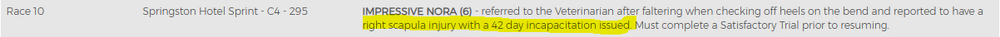 Speaking of injuries, I've tossed in the towel on rail contact. I've made my point on that one. This year I'm beginning a new direction, injuries & the dirty behind the scenes tactics GRNZ has taken to minimize them (hint: it's not fixing broken tracks). GRNZ bracket injuries into categories, with the seriousness of the injury into mainly 4 of them. 1-10 days (minor), 11-21 days (medium), 22-42 days (major 1) and 43-90 days (major 2). Look at this remarkable occurrence, just in one race day (4 Jan) on two different tracks with obviously different vets (Addington/Cambridge). Cambridge~ Addington~ 3 different dogs, 2 different vets & 3 completely different injuries. All received a 42-day incapacitation, which is remarkably (conveniently) 1 day less then bumping up to the next severity in their data. A fractured toe, a torn gracilis & a scapula injury all take the exact same time to recover from. Yeah, ok GRNZ & the guidelines you've handed out to the RIB (totally independent) vets, no-one will ever pick up on that one, right?