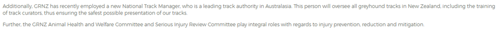 24. Maybe I misunderstand the GRNZ requirements. Animal welfare only matters when something is done to a greyhound deliberately. There is no requirement for a trainer to keep their dogs out of harm's way. I suppose the RIU/RIB check trainer's vehicles/trailers for warrants/registrations & hand out fines when they're out of date because they are nosey. Got it.