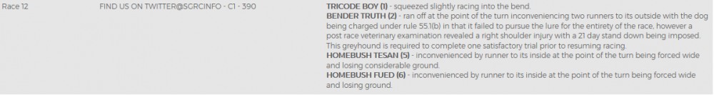 23. One further note for GRNZ & the RIU.... Even though this dog has never had 10 clear "consecutive" runs in its lifetime, its run on 16/10/18 should not be classified as a clear run in the count back, as initially the dog was CHARGED before the vet did the connections a huge favour by finding an injury that wasn't there in the first place. Fake injuries are "favours" to connections of a dog, at the expense of a largely increased potential risk to dogs it will race against in the future and misleading information to punters who ultimately fund the sport.
