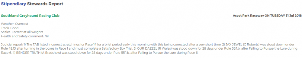 2. https://www.grnz.co.nz/catch-the-action/13402/stewards-report.aspx FUNZALO (1) - In contact into first turn and unbalanced. Turned his head out to another runner soon after and was referred to the Vet and cleared. Was stood down for 3 months for a 2nd offence under Rule 55.1 b and is required to complete a satisfactory trial before next racing.BIGTIME COOPER (2) - in contact and unbalanced into first turn. Marred soon after and lost ground and was crowded into final bend and went back to the rear and stayed back. So why wasn't marring 55.1a charged? Watch Fridays Stewards report for the fake 21 or more day injury to turn up....