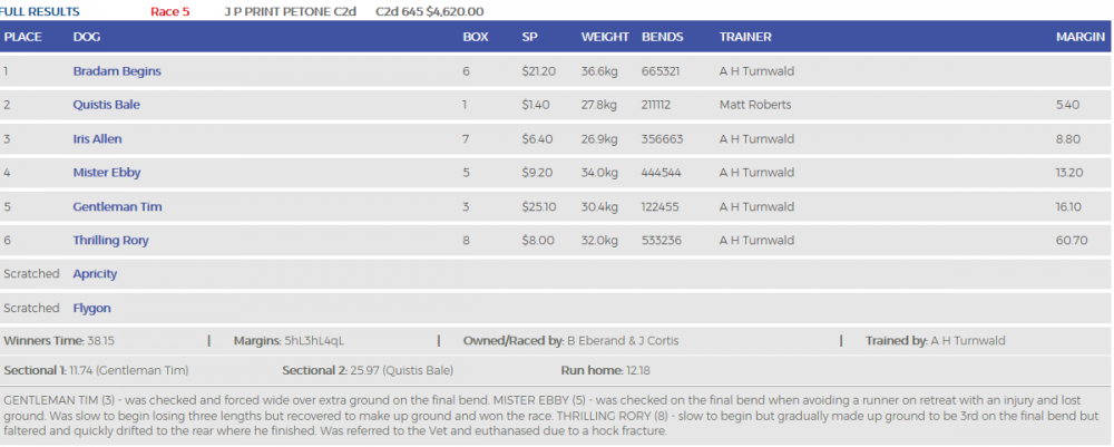 This won't help from last night... GOTCHA MAJENTA in race 6 began awkwardly and ran with a very awkward action until making contact with the rail and falling before the first turn. In the opinion of the Vet, she had suffered a severe leg injury soon after leaving the boxes and was euthanased. https://www.grnz.co.nz/catch-the-action/13131/stewards-report.aspx I won't post a link to the video, but is being available on the GRNZ website a good idea?