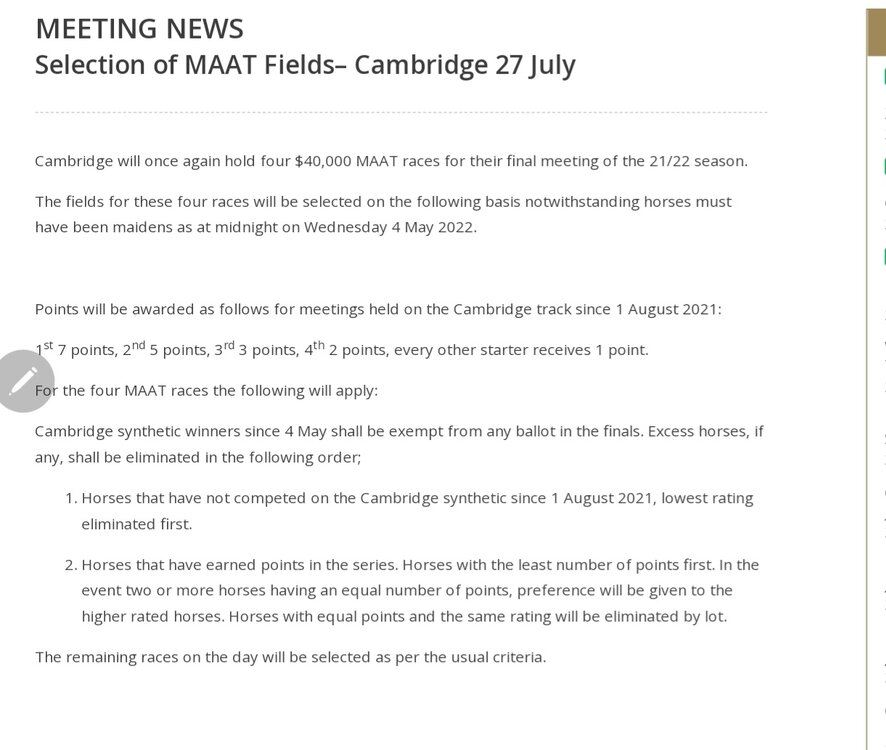 Thank you Freda, for bringing this to our attention, After a little research I see that last year (28thJuly)Cambridge ran a 4 race MAAT series with 4x$40,000 races.... The indication was that these races would be run after the opening of each synthetic track...a similar 4 race MAAT meeting is programmed for Riccarton(15thJuly) . In contrast to this year's second annual running of the MAAT races at Cambridge (27th July),where the stake is $40000 per race for the second year, it would appear as though the S.I. series has been relegated to its usual, second class citizen status, with stakes of less than 50%($17,000) of our northern counterparts.