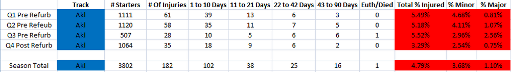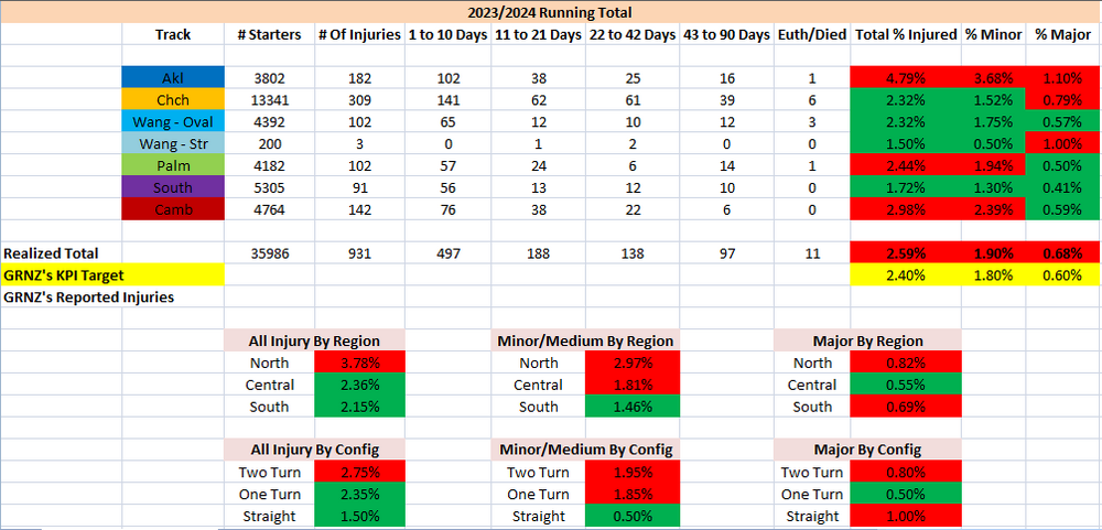 Yankiwi Posted February 21, 2024 Author Posted February 21, 2024 Brief study #7 How does the speed of travel over the racing surface effect racing injuries? Would be a very difficult study to undertake properly without automation, so I simply have chosen to take the easy way out to gain some perspective. Each individual track, each sprint and middle distance, using the track record time for each distance, average each tracks combined distance results. Injury data is from my overall 2023/24 season, which is still underway & being recorded. The spreadsheet has been arranged in descending order of average speed (fastest average KM/H top, slowest KM/H bottom). Take away. The two fastest tracks are currently returning high percentages in minor injury data but remain well within GRNZ's KPI major injury target. The two slowest tracks are currently returning the highest percentage of major injuries per start. All three two turn tracks are slower than the slowest one turn track. Biggest surprise - Cambridge & Southland middle distance record time, the dog averaged a faster average speed than the sprint record time, each by roughly 1/2 KPH. Most importantly (to me), this is not an avenue I'll expend any further energy on pursuing at this point. Quote