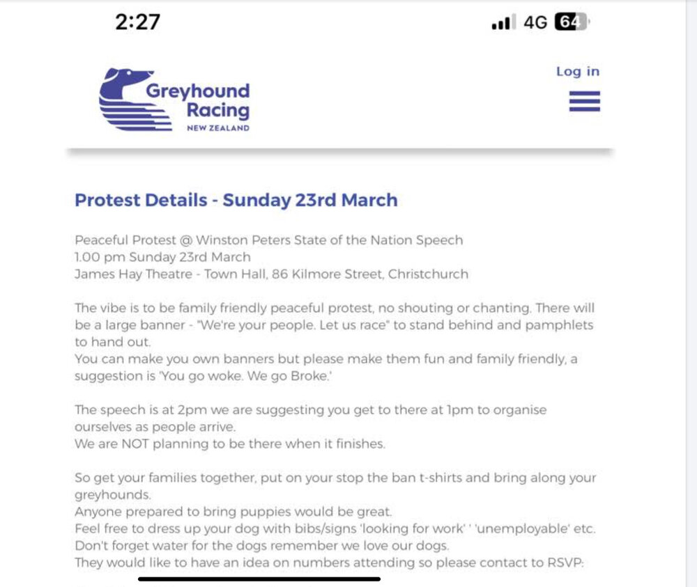 BitofaLegend Posted March 24 Posted March 24 (edited) Peters response to the protest - so it was heard. All in all though, doesnt seem like it was very successful with only 70 people attending - Only a handful of antis turned up though and supposedly, some were arrested. Peters has also called for the thouroubreds and harness to modernise themselves (although he says they are 100% safe) and mentions GRNZ are challenging the bans legality. https://www.nzherald.co.nz/sport/racing/winston-peters-digs-in-for-battle-on-greyhound-ban/PTOE6XJRVNF4DEY6OQ2RG5GEPU/ Edited March 24 by BitofaLegend Quote