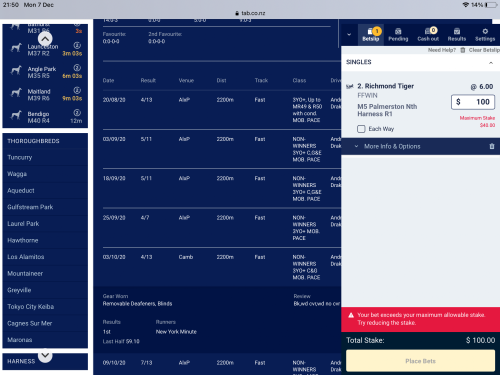 Forbury Posted December 4, 2020 Posted December 4, 2020 I am that restricted when I bet fixed on nztab that I am not allowed to win more than a few hundred dollars and the price won't change and I cannot back it at a lower price.i do not bet fixed odds as a result.as for Tabcorp my bets go up for review if they will accept and for how much.i have been restricted with every bookie and cannot bet with any unless I use bowling accounts. Quote